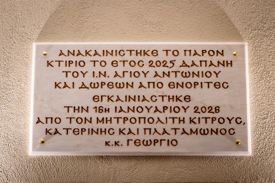 Τα εγκαίνια του νέου Ενοριακού Νεανικού Πνευματικού Κέντρου του Ιερού Ναού Αγίου Αντωνίου Σβορώνου τέλεσε, το απόγευμα της Παρασκευής 16 Ιανουαρίου, ο Σεβασμιώτατος Μητροπολίτης Κίτρους, Κατερίνης και Πλαταμώνος κ. Γεώργιος, παρουσία εκπροσώπων των τοπικών αρχών και πλήθους πιστών, προσφέροντας στην Ενορία και στην τοπική κοινωνία έναν σύγχρονο χώρο πνευματικής και δημιουργικής συνάντησης.