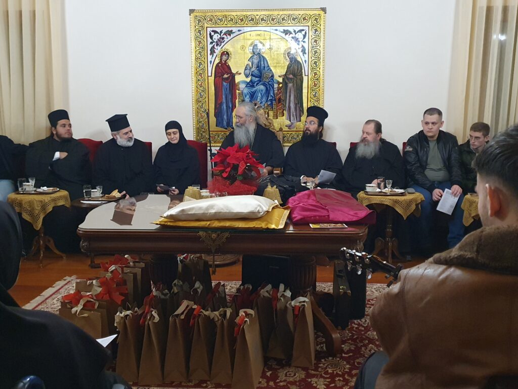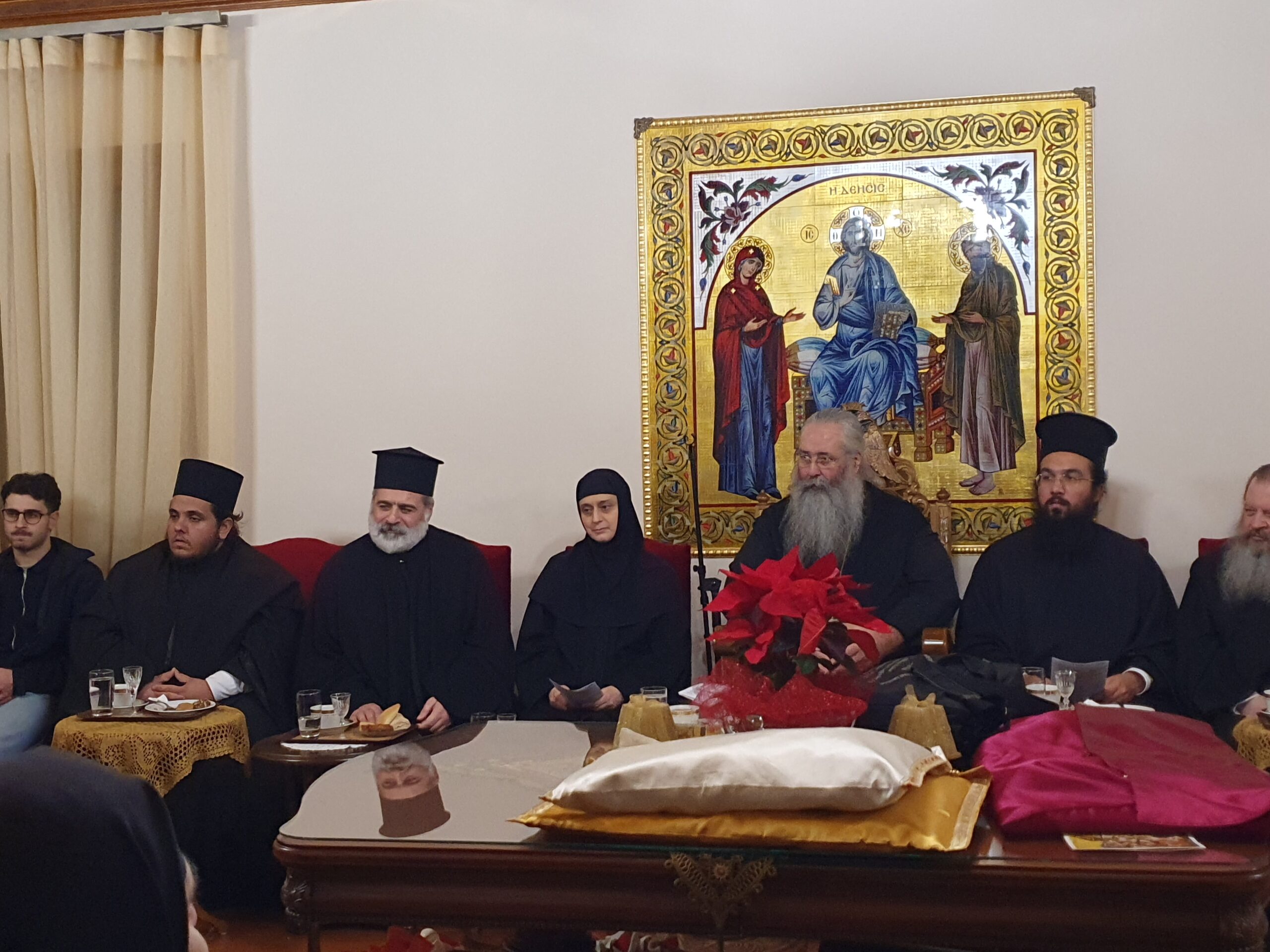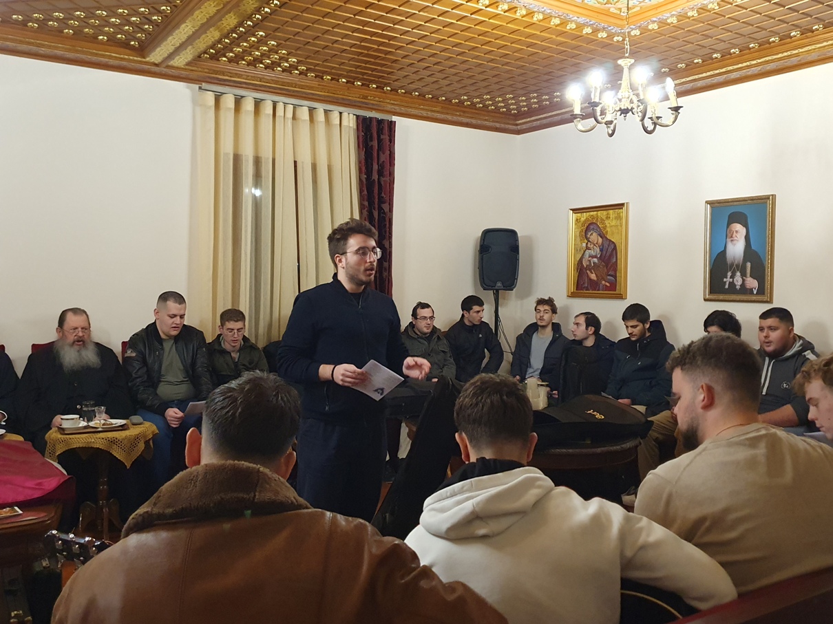 Μετά τον Εσπερινό, οι Φοιτητές μετέβησαν στο Αρχονταρίκι, όπου οι Μοναχές παρέθεσαν εόρτια δεξίωση, κατά την οποία μίλησαν με πνευματικούς λόγους ο Σύριος Ιερέας π. Φίλιππος, καθώς και η Γερόντισσα Μαρία, κάνοντας αναφορές στον αγώνα που δίνουν καθημερινά οι χριστιανοί στην πολύπαθη Συρία και το μαρτυρικό βίωμα που φέρουν.